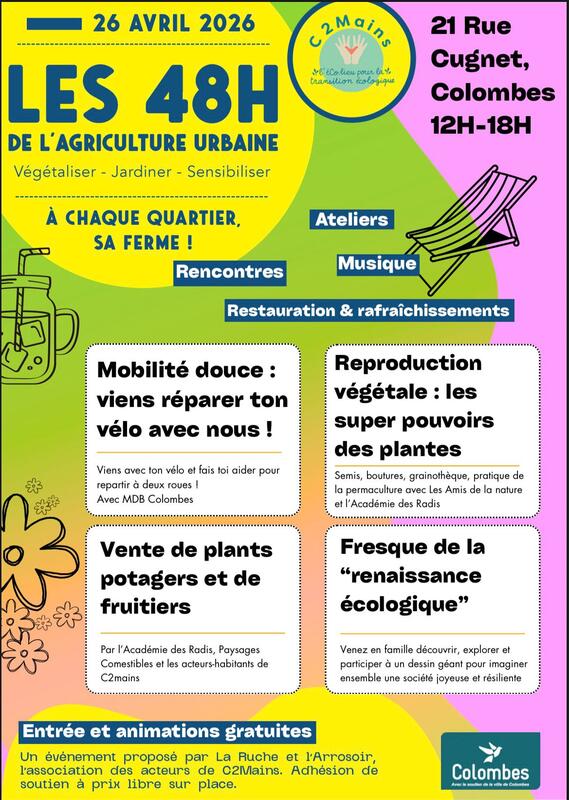 Ateliers gratuits : Fresque de la biodiversité, initiation à l’aquaponie, chantier de permaculture, atelier de reproduction végétale, vente de plants et d'arbres fruitiers au bénéfice d'associations de Colombes, découverte des paniers AMAP, réparation de vélos, et d'autres surprises qui vous attendent...